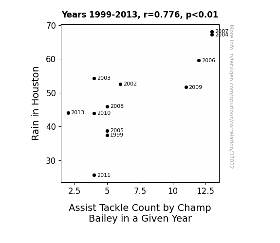This means 60.3% of the change in the one variable (i.e., Assist Tackle Count by Champ Bailey in a Given Year) is predictable based on the change in the other (i.e., Rain in Houston) over the 12 years from 1999 through 2013.