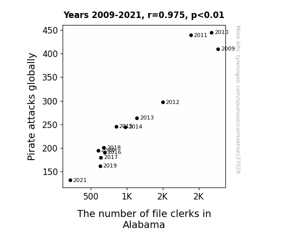 This means 95.1% of the change in the one variable (i.e., The number of file clerks in Alabama) is predictable based on the change in the other (i.e., Pirate attacks globally) over the 13 years from 2009 through 2021.