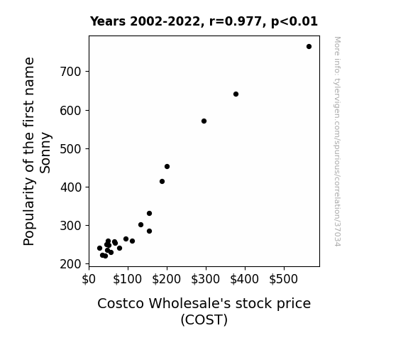 This means 95.4% of the change in the one variable (i.e., Costco Wholesale's stock price (COST)) is predictable based on the change in the other (i.e., Popularity of the first name Sonny) over the 21 years from 2002 through 2022.