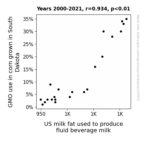 This means 87.2% of the change in the one variable (i.e., US milk fat used to produce fluid beverage milk) is predictable based on the change in the other (i.e., GMO use in corn grown in South Dakota) over the 22 years from 2000 through 2021.
