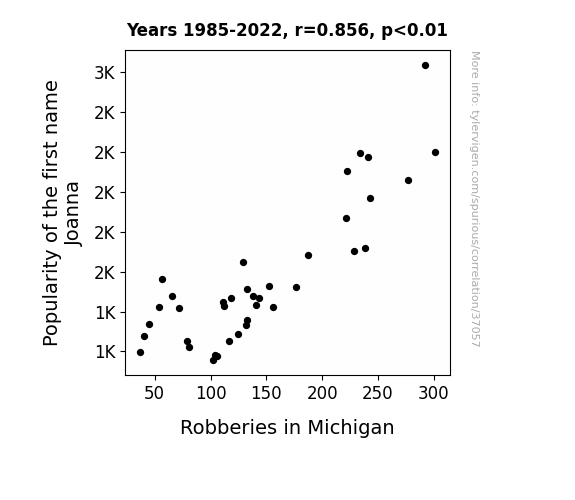 This means 73.3% of the change in the one variable (i.e., Robberies in Michigan) is predictable based on the change in the other (i.e., Popularity of the first name Joanna) over the 38 years from 1985 through 2022.