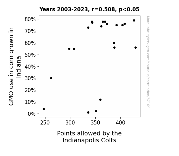 This means 25.8% of the change in the one variable (i.e., Points allowed by the Indianapolis Colts) is predictable based on the change in the other (i.e., GMO use in corn grown in Indiana) over the 21 years from 2003 through 2023.
