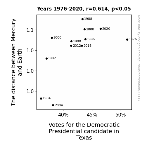 This means 37.6% of the change in the one variable (i.e., Votes for the Democratic Presidential candidate in Texas) is predictable based on the change in the other (i.e., The distance between Mercury and Earth) over the 12 years from 1976 through 2020.