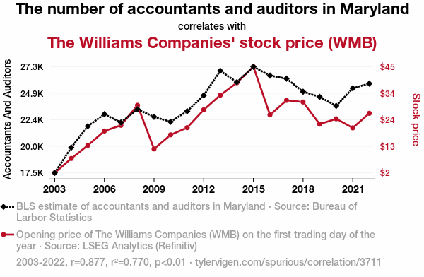 This means 77% of the change in the one variable (i.e., The Williams Companies' stock price (WMB)) is predictable based on the change in the other (i.e., The number of accountants and auditors in Maryland) over the 20 years from 2003 through 2022.