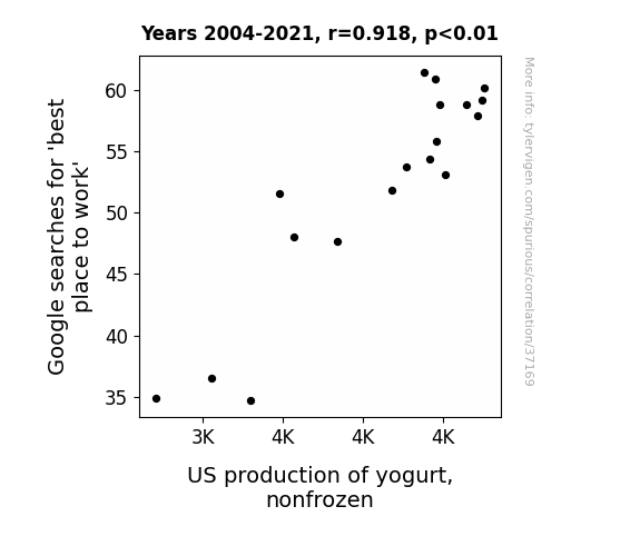 This means 84.3% of the change in the one variable (i.e., US production of yogurt, nonfrozen) is predictable based on the change in the other (i.e., Google searches for 'best place to work') over the 18 years from 2004 through 2021.