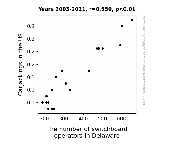 This means 90.3% of the change in the one variable (i.e., The number of switchboard operators in Delaware) is predictable based on the change in the other (i.e., Carjackings in the US) over the 19 years from 2003 through 2021.
