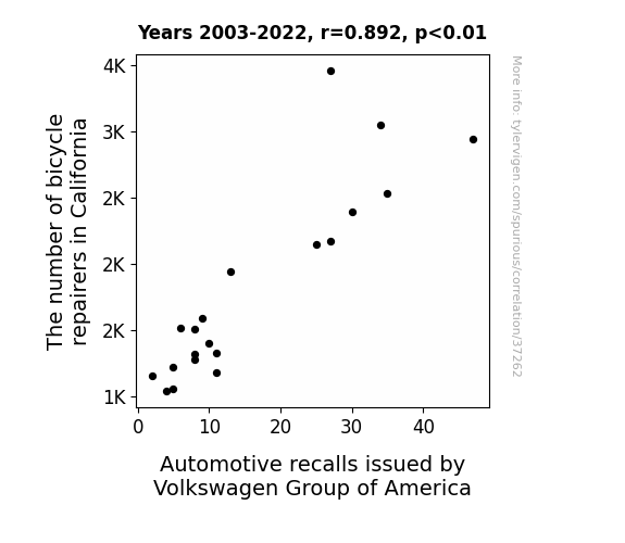 This means 79.5% of the change in the one variable (i.e., Automotive recalls issued by Volkswagen Group of America) is predictable based on the change in the other (i.e., The number of bicycle repairers in California) over the 20 years from 2003 through 2022.