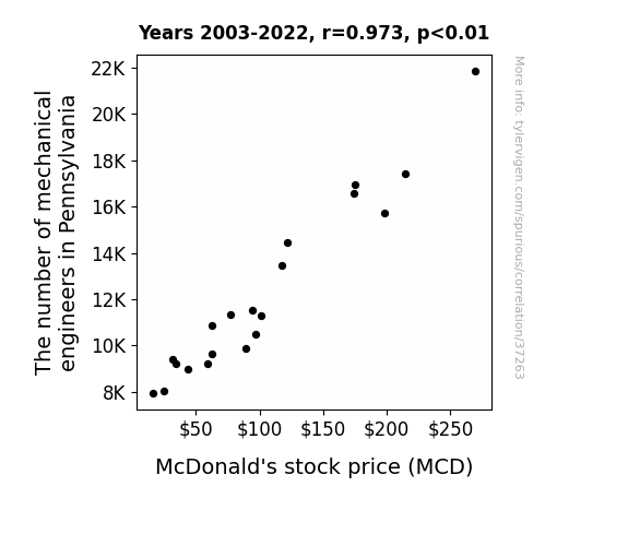 This means 94.6% of the change in the one variable (i.e., McDonald's stock price (MCD)) is predictable based on the change in the other (i.e., The number of mechanical engineers in Pennsylvania) over the 20 years from 2003 through 2022.
