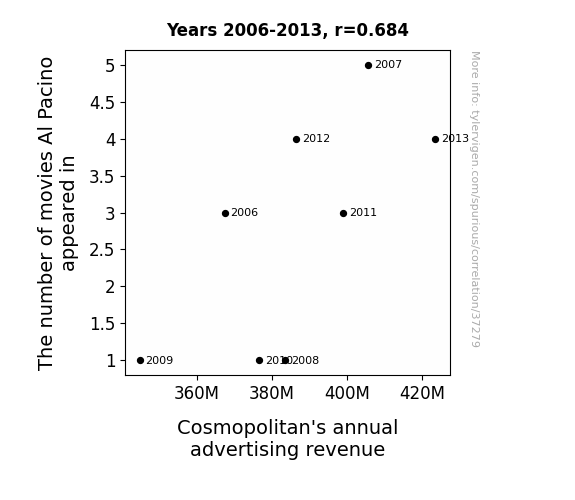 This means 46.8% of the change in the one variable (i.e., Cosmopolitan's annual advertising revenue) is predictable based on the change in the other (i.e., The number of movies Al Pacino appeared in) over the 8 years from 2006 through 2013.