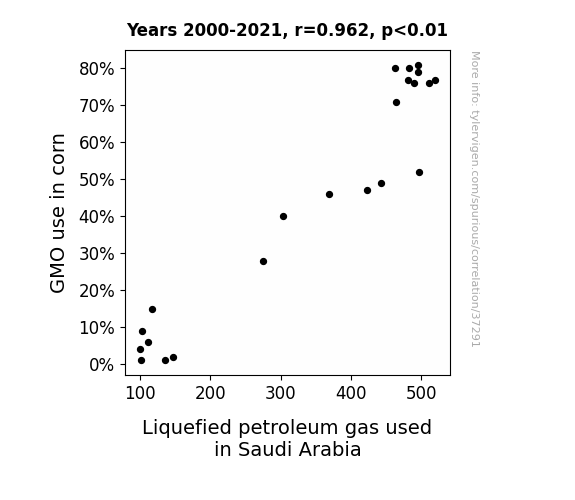 This means 92.5% of the change in the one variable (i.e., Liquefied petroleum gas used in Saudi Arabia) is predictable based on the change in the other (i.e., GMO use in corn) over the 22 years from 2000 through 2021.