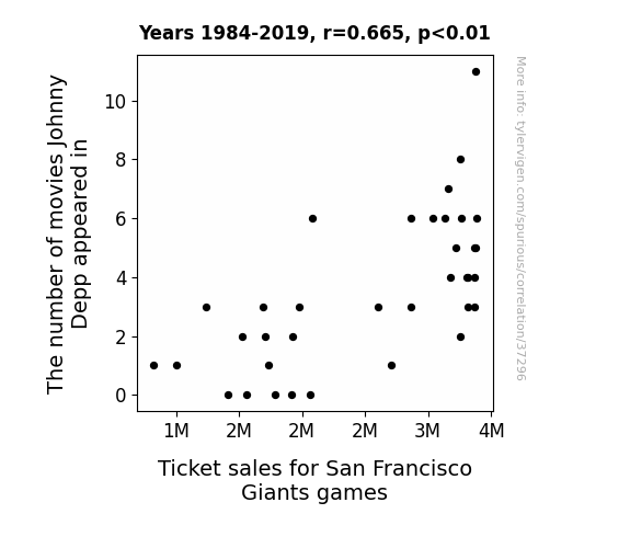 This means 44.3% of the change in the one variable (i.e., Ticket sales for San Francisco Giants games) is predictable based on the change in the other (i.e., The number of movies Johnny Depp appeared in) over the 36 years from 1984 through 2019.