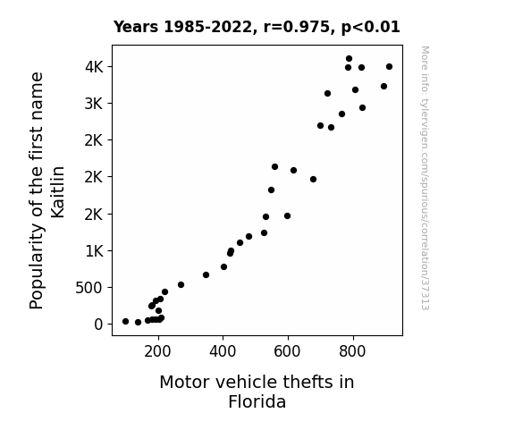 This means 95% of the change in the one variable (i.e., Motor vehicle thefts in Florida) is predictable based on the change in the other (i.e., Popularity of the first name Kaitlin) over the 38 years from 1985 through 2022.