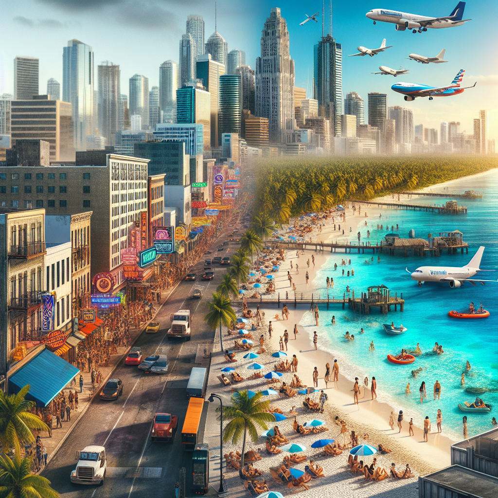 Prompt: Generate an image that seamlessly blends a bustling street in the United States, filled with lively breweries and throngs of people, with a serene beach in Belize gradually overwhelmed by an increasing number of planes landing, symbolizing a surge in fossil fuel usage as visitors flock to enjoy the beautiful seaside with refreshing beverages. The image should convey the stark contrast between the urban and natural environments, capturing the essence of dynamic societal choices and their impact on the environment. The scene should be rich in detail and depth, evoking a sense of awe and reflection. The depiction should include only scenes, people, and objects, it should not include text or speech bubbles.