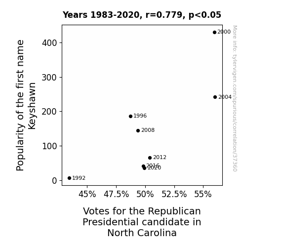 This means 60.6% of the change in the one variable (i.e., Votes for the Republican Presidential candidate in North Carolina) is predictable based on the change in the other (i.e., Popularity of the first name Keyshawn) over the 8 years from 1983 through 2020.