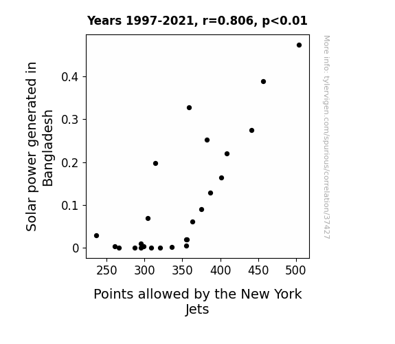 This means 64.9% of the change in the one variable (i.e., Points allowed by the New York Jets) is predictable based on the change in the other (i.e., Solar power generated in Bangladesh) over the 25 years from 1997 through 2021.