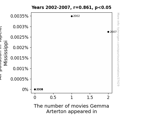 This means 74.1% of the change in the one variable (i.e., The number of movies Gemma Arterton appeared in) is predictable based on the change in the other (i.e., Air pollution in Tupelo, Mississippi) over the 6 years from 2002 through 2007.