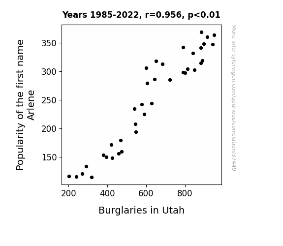 This means 91.4% of the change in the one variable (i.e., Burglaries in Utah) is predictable based on the change in the other (i.e., Popularity of the first name Arlene) over the 38 years from 1985 through 2022.