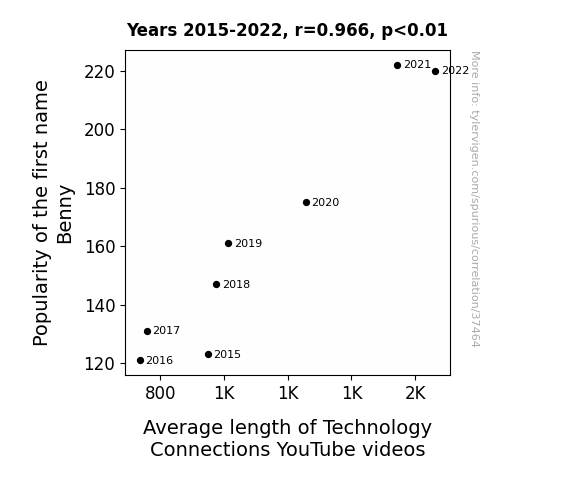 This means 93.4% of the change in the one variable (i.e., Average length of Technology Connections YouTube videos) is predictable based on the change in the other (i.e., Popularity of the first name Benny) over the 8 years from 2015 through 2022.