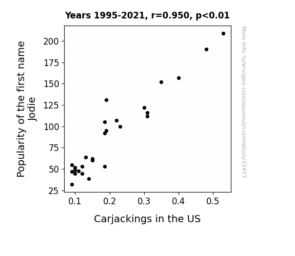 This means 90.3% of the change in the one variable (i.e., Carjackings in the US) is predictable based on the change in the other (i.e., Popularity of the first name Jodie) over the 27 years from 1995 through 2021.