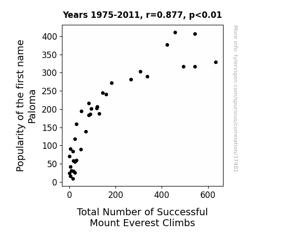 This means 76.9% of the change in the one variable (i.e., Total Number of Successful Mount Everest Climbs) is predictable based on the change in the other (i.e., Popularity of the first name Paloma) over the 37 years from 1975 through 2011.