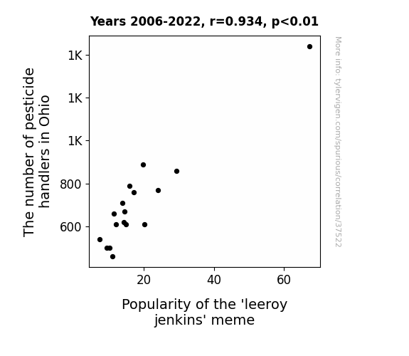 This means 87.3% of the change in the one variable (i.e., Popularity of the 'leeroy jenkins' meme) is predictable based on the change in the other (i.e., The number of pesticide handlers in Ohio) over the 17 years from 2006 through 2022.