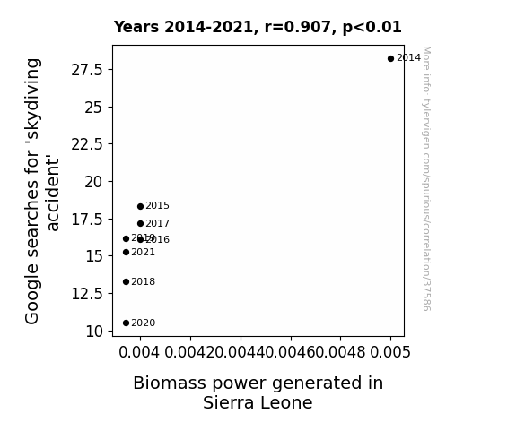 This means 82.2% of the change in the one variable (i.e., Biomass power generated in Sierra Leone) is predictable based on the change in the other (i.e., Google searches for 'skydiving accident') over the 8 years from 2014 through 2021.