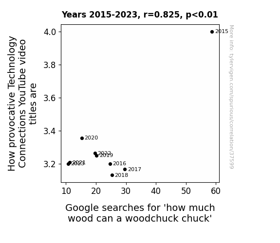This means 68% of the change in the one variable (i.e., Google searches for 'how much wood can a woodchuck chuck') is predictable based on the change in the other (i.e., How provocative Technology Connections YouTube video titles are) over the 9 years from 2015 through 2023.