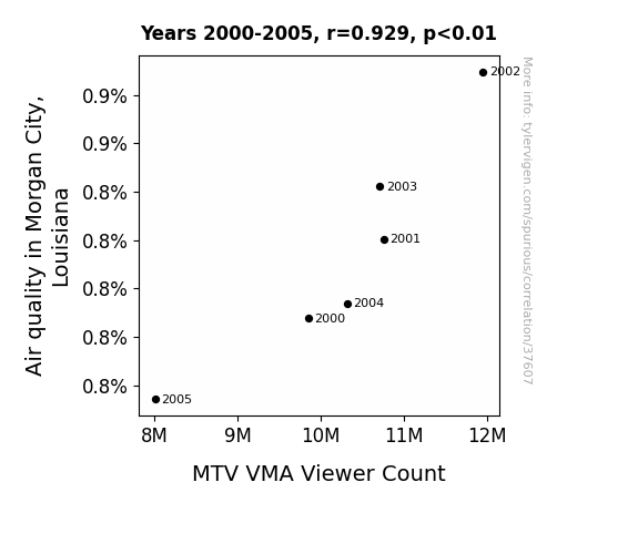 This means 86.4% of the change in the one variable (i.e., MTV VMA Viewer Count) is predictable based on the change in the other (i.e., Air quality in Morgan City, Louisiana) over the 6 years from 2000 through 2005.