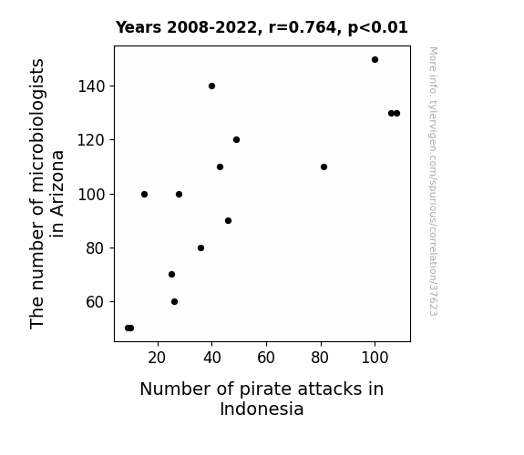 This means 58.4% of the change in the one variable (i.e., Number of pirate attacks in Indonesia) is predictable based on the change in the other (i.e., The number of microbiologists in Arizona) over the 15 years from 2008 through 2022.