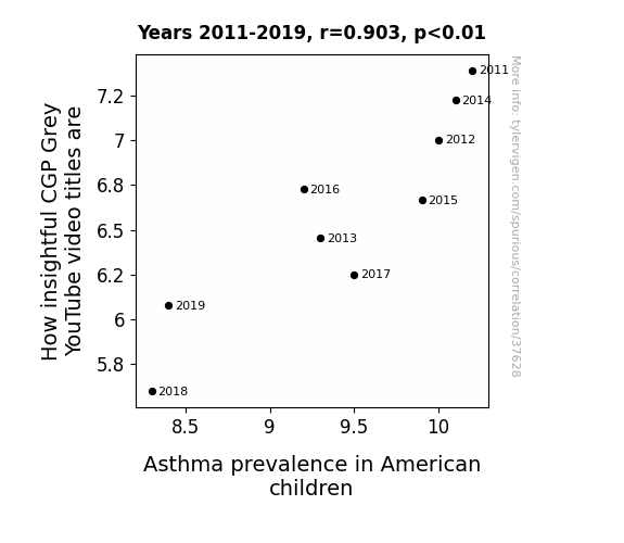 This means 81.6% of the change in the one variable (i.e., Asthma prevalence in American children) is predictable based on the change in the other (i.e., How insightful CGP Grey YouTube video titles are) over the 9 years from 2011 through 2019.