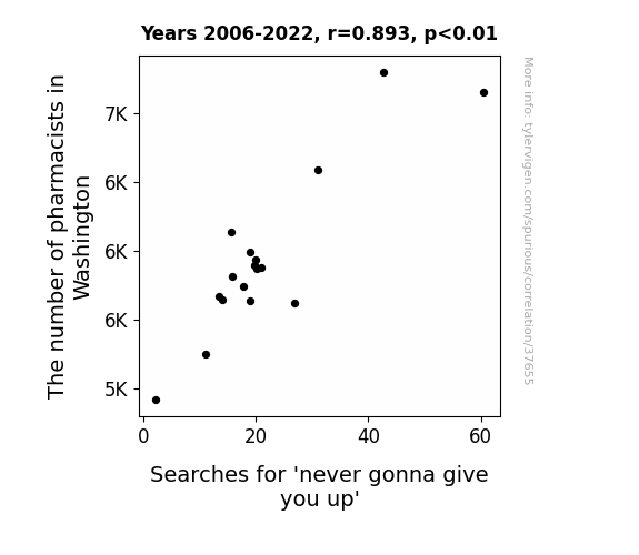 This means 79.8% of the change in the one variable (i.e., Searches for 'never gonna give you up') is predictable based on the change in the other (i.e., The number of pharmacists in Washington) over the 17 years from 2006 through 2022.