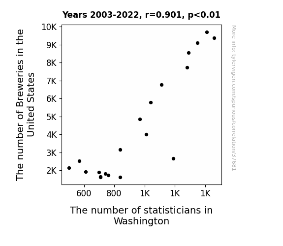 This means 81.2% of the change in the one variable (i.e., The number of statisticians in Washington) is predictable based on the change in the other (i.e., The number of Breweries in the United States) over the 20 years from 2003 through 2022.
