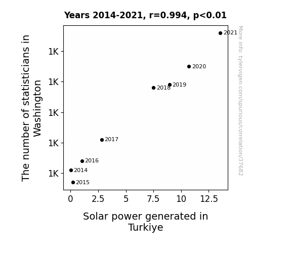 This means 98.8% of the change in the one variable (i.e., Solar power generated in Turkiye) is predictable based on the change in the other (i.e., The number of statisticians in Washington) over the 8 years from 2014 through 2021.