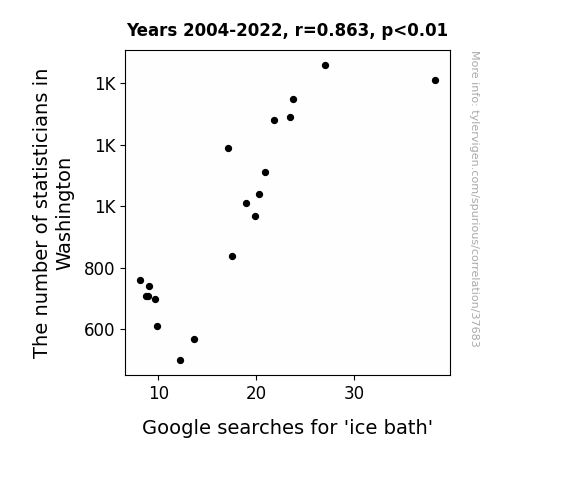 This means 74.4% of the change in the one variable (i.e., Google searches for 'ice bath') is predictable based on the change in the other (i.e., The number of statisticians in Washington) over the 19 years from 2004 through 2022.