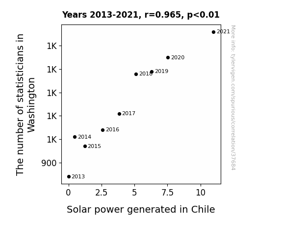 This means 93.2% of the change in the one variable (i.e., Solar power generated in Chile) is predictable based on the change in the other (i.e., The number of statisticians in Washington) over the 9 years from 2013 through 2021.
