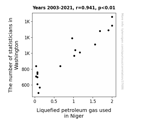 This means 88.6% of the change in the one variable (i.e., Liquefied petroleum gas used in Niger) is predictable based on the change in the other (i.e., The number of statisticians in Washington) over the 19 years from 2003 through 2021.