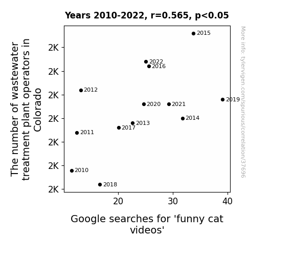 This means 31.9% of the change in the one variable (i.e., Google searches for 'funny cat videos') is predictable based on the change in the other (i.e., The number of wastewater treatment plant operators in Colorado) over the 13 years from 2010 through 2022.
