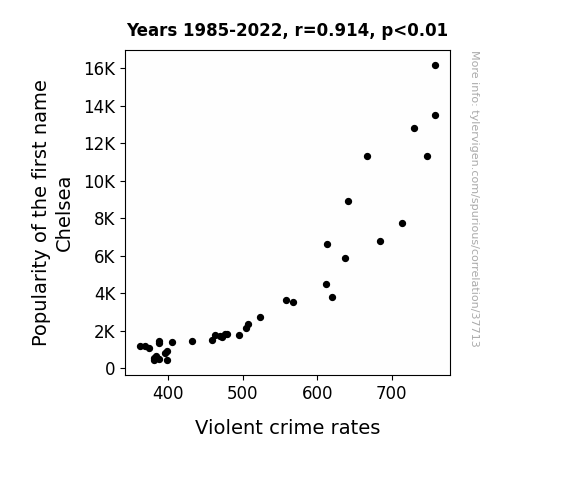 This means 83.6% of the change in the one variable (i.e., Violent crime rates) is predictable based on the change in the other (i.e., Popularity of the first name Chelsea) over the 38 years from 1985 through 2022.