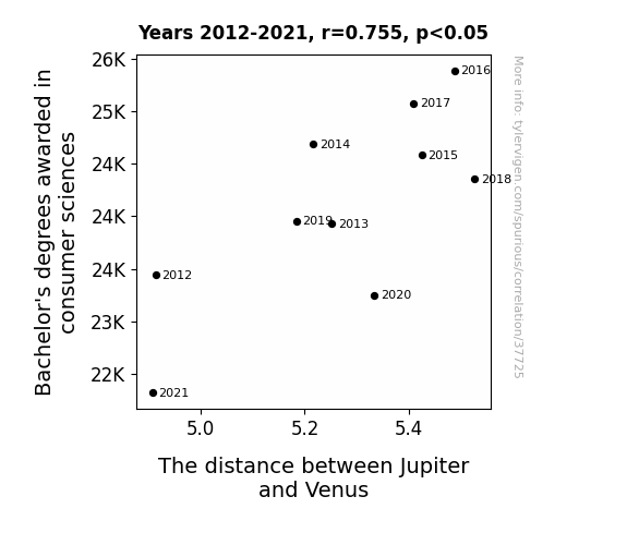 This means 57% of the change in the one variable (i.e., The distance between Jupiter and Venus) is predictable based on the change in the other (i.e., Bachelor's degrees awarded in consumer sciences) over the 10 years from 2012 through 2021.