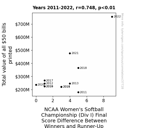This means 55.9% of the change in the one variable (i.e., NCAA Women's Softball Championship (Div I) Final Score Difference Between Winners and Runner-Up) is predictable based on the change in the other (i.e., Total value of all $50 bills printed) over the 12 years from 2011 through 2022.