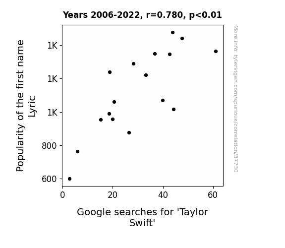 This means 60.8% of the change in the one variable (i.e., Google searches for 'Taylor Swift') is predictable based on the change in the other (i.e., Popularity of the first name Lyric) over the 17 years from 2006 through 2022.