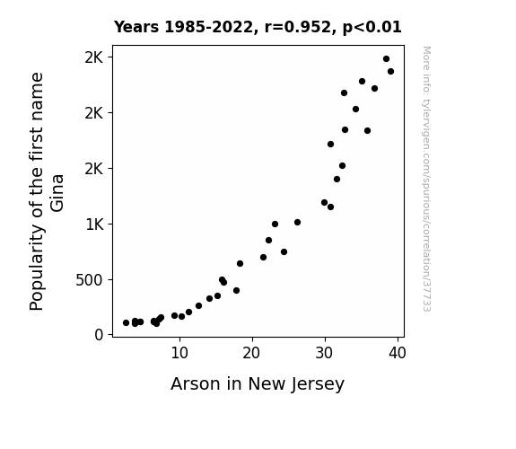 This means 90.6% of the change in the one variable (i.e., Arson in New Jersey) is predictable based on the change in the other (i.e., Popularity of the first name Gina) over the 38 years from 1985 through 2022.