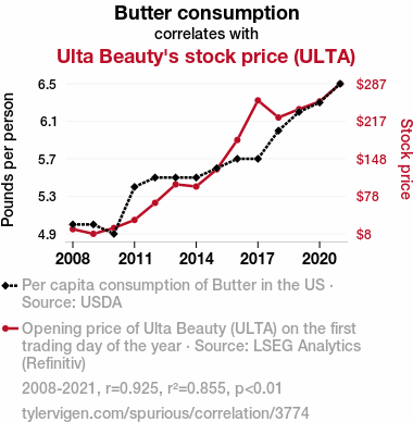 butter consumption, Ulta Beauty stock price, finance, correlation coefficient, traditional financial analysis, dairy products, stock market, investment strategies, financial forecasting, USDA data, LSEG Analytics, Refinitiv, butter consumption and stock prices