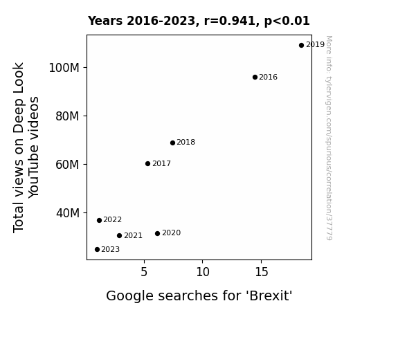 This means 88.5% of the change in the one variable (i.e., Google searches for 'Brexit') is predictable based on the change in the other (i.e., Total views on Deep Look YouTube videos) over the 8 years from 2016 through 2023.