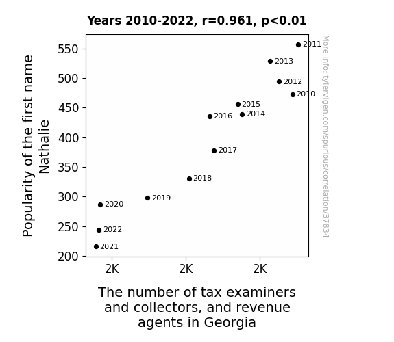This means 92.4% of the change in the one variable (i.e., The number of tax examiners and collectors, and revenue agents in Georgia) is predictable based on the change in the other (i.e., Popularity of the first name Nathalie) over the 13 years from 2010 through 2022.