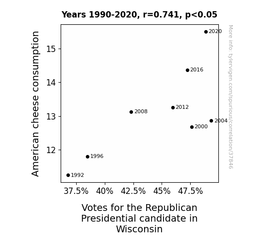 This means 54.8% of the change in the one variable (i.e., Votes for the Republican Presidential candidate in Wisconsin) is predictable based on the change in the other (i.e., American cheese consumption) over the 8 years from 1990 through 2020.