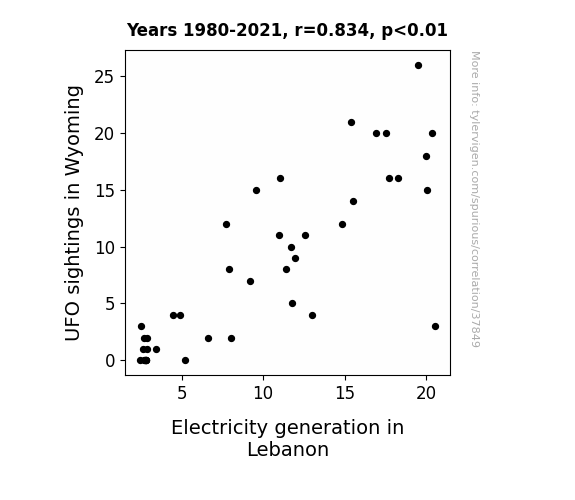 This means 69.6% of the change in the one variable (i.e., Electricity generation in Lebanon) is predictable based on the change in the other (i.e., UFO sightings in Wyoming) over the 42 years from 1980 through 2021.
