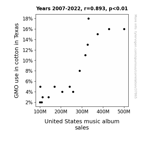 This means 79.7% of the change in the one variable (i.e., United States music album sales) is predictable based on the change in the other (i.e., GMO use in cotton in Texas) over the 16 years from 2007 through 2022.