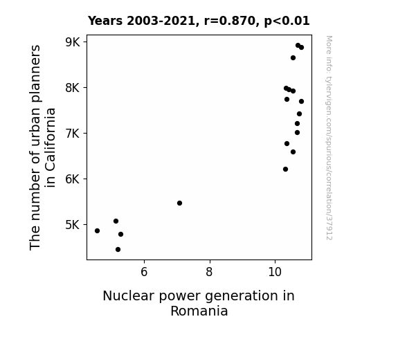 This means 75.7% of the change in the one variable (i.e., Nuclear power generation in Romania) is predictable based on the change in the other (i.e., The number of urban planners in California) over the 19 years from 2003 through 2021.