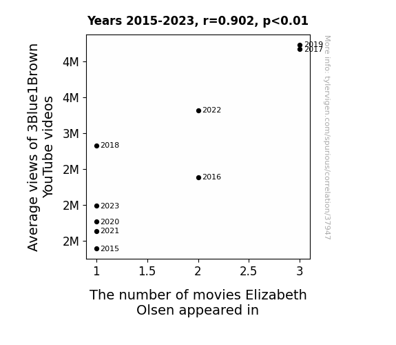 This means 81.4% of the change in the one variable (i.e., The number of movies Elizabeth Olsen appeared in) is predictable based on the change in the other (i.e., Average views of 3Blue1Brown YouTube videos) over the 9 years from 2015 through 2023.